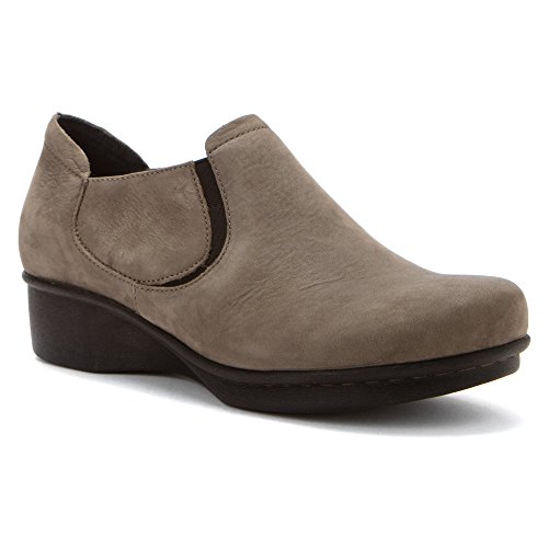 Slide-on shoe with leather upper featuring elasticized gored insets at entry