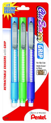 Pentel Clic Retractable Eraser with Grip, Assorted Barrels, 3 Pack (ZE21TBP3M)