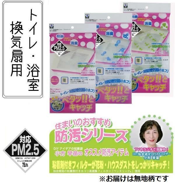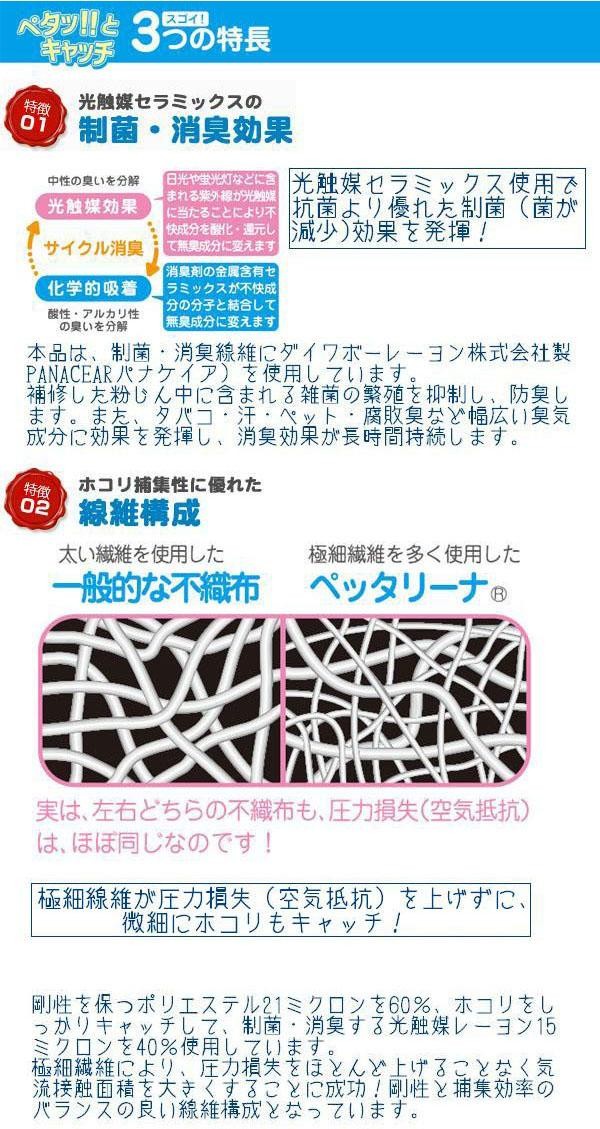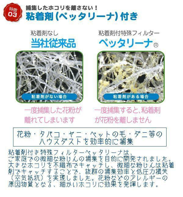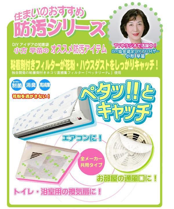 粘着材付きフィルターが花粉・ハウスダストをしっかりキャッチ!!独自開発の粘着剤付きホコリ高捕集フィルター「ペッタリーナ(R)」を使用。DIYアイデアの知恵袋「小方早苗」さんオススメの防汚アイテムです。 | |