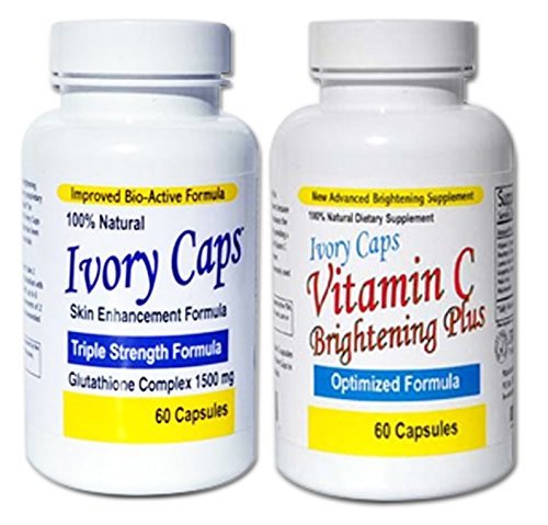 -. Binding : Misc. -. Brand : jenicalimited -. EAN : 5054515851508 -. Feature : Set Includes: Ivory Caps Glutathione Complex Capsules Ivory Caps Vitamin C Brightening Plus -60 Capsules each -1500mg Glutathione Complex / - Ivory Caps and Vitamin C Brightening Plus are 100% vegetarian. There is no gelatin in the products or the capsules which are (veg-caps). -100% Natural - Improved bio-active formula -Prevents the oxidation (darkening) of existing skin melanin / -Precipitates the shedding / removal of melanin laden skin cells -Regulation / Reduction of pigment production -100% Natural Brightening Supplement / -100% Natural Brightening Supplement -Assists in the absorption and utilization of Glutathione and other nutrients -Vitamin C from several sources optimized to provide enhance benefits / -Key herbs and nutrients including Bearberry (Arbutin) to contribute to even greater skin brightening support and enhancement benefit. -Specially developed to work along with the Ivory Caps Skin Regimen. -. IsAdultProduct : 0 -. MPN : na -. PackageQuantity : 1 -. PartNumber : na -. ProductGroup : Beauty -. ProductTypeName : BEAUTY -. Title : IVORY CAPS SKIN ENHANCEMENT GLUTATHIONE & VITAMIN C SET -Prevents the oxidation (darkening) of existing skin melanin -Precipitates the shedding / removal of melanin laden skin cells by jenicalimited