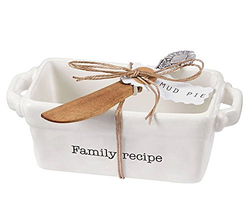 - Ceramic oven-to table mini-loaf dish with chunky handles features debossed "family recipe" sentiment and arrives with silver plate