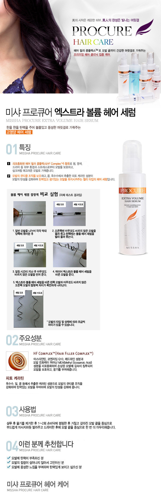 髪の毛一本一本に弾力を与え、ボリュームたっぷりなさらさら髪に仕上げる高栄養ヘアーセラムです。【使用方法】シャンプーの後水気を取り、1~2回プッシュしカサカサな髪の毛の先を中心にやさしくマッサージするように塗り、ドライした後もう一回髪の毛の先に塗って仕上げます。【商品構成】ミーシャプロキュアエキストラボリュームヘアーセラム100ml