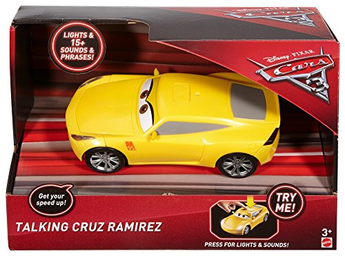 -. Binding : Toy -. Brand : Disney -. EAN : 0887961406214 -. Feature : New Disney/Pixar Cars 3 vehicles say over 15 movie-inspired phrases / 1:21 scale with iconic details and working head and taillights / Recreate favorite scenes with authentic action and sounds! / Great gift for any Disney/Pixar Cars fan / Collect them all -. IsAdultProduct : 0 -. Label : Mattel -. Manufacturer : Mattel -. Model : DXY23 -. MPN : DXY23 -. PackageQuantity : 1 -. PartNumber : DXY23 -. ProductGroup : Toy -. ProductTypeName : TOYS_AND_GAMES -. Publisher : Mattel -. Studio : Mattel -. Title : Disney Pixar Cars 3 Cruz Ramirez Vehicle, 1:21 Scale -. UPC : 887961406214 -. Warranty : 1 year warranty against manufacturer defects
