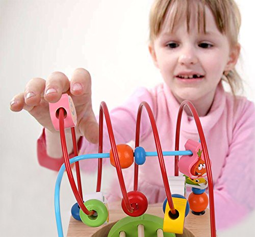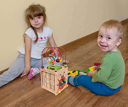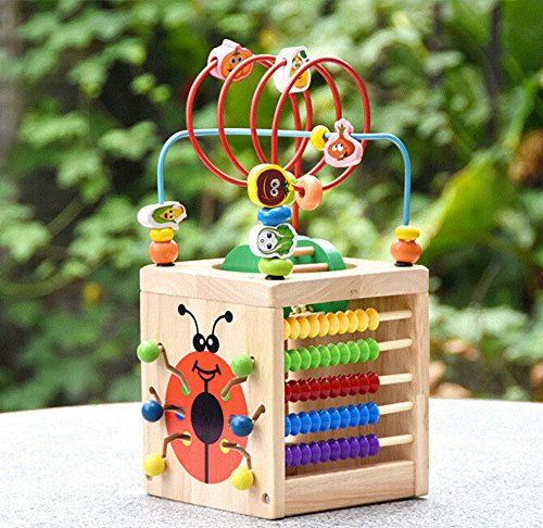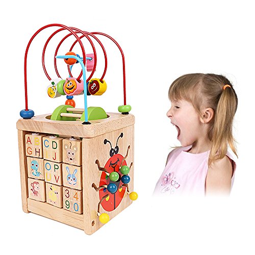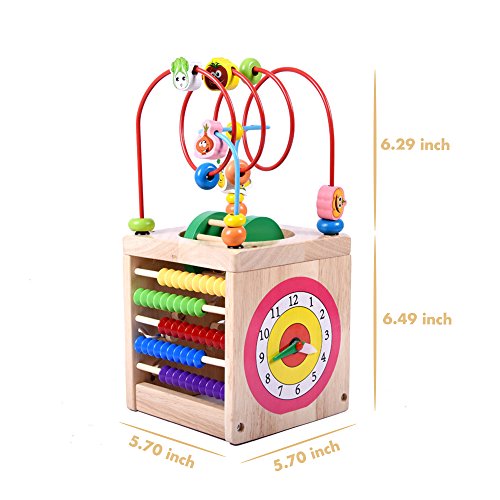 -. Feature : Natural & Non-Toxic --- Made of natural hardwood and stained with non-toxic water-based paint - so it's kid safe for curious babies and toddlers. / 6 Sides of Activities --- This baby activity cube keeps child entertained with geometric shape sorting, counting beads, sliding animals, spinning bell and a wire bead maze on top. / Learning Cube Toy --- Exciting colors and gadgets encourage sensory stimulation and brain development. Bead mazes encourage reach, sliders promote abacus skills, gears spur logical thinking, and more. / Bead Maze Toy --- Includes 12.6x5.9x 5.9 inch wooden cube with curvy wire rides, learning clock, spin and match animals, turn and learn abc word tiles, abacus and bead roll maze. / Gift --- This toy is ideal for littler and big kids ages 3 and up.Encourage your child to recognize shapes, colors, and more as they develop fine motor and problem solving skills. Kids will love this gift! It is a best gift for Baby's & Toddlers.