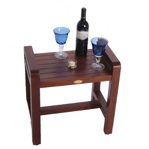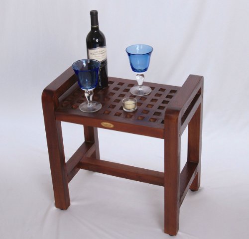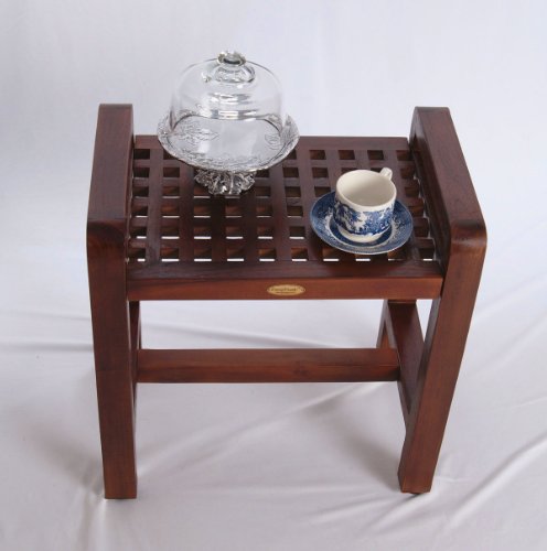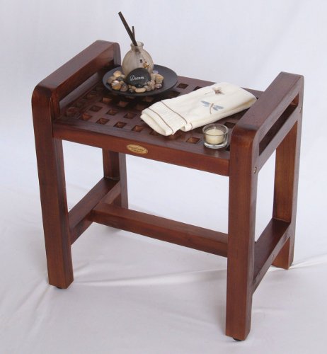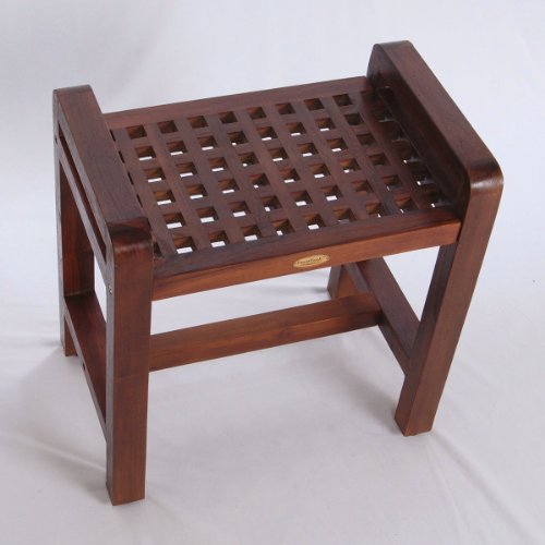 Studio : DecoTeak Publisher : DecoTeak Binding : Kitchen Product Description Designed fro safety and comfort. LIFTAIDE active assist raised arms for extra ergonomic support. Raised support cross bar increases stability and safety. This allows the use of ADJUSTABLE HEIGHT FOOT PADS for independent adjustment in height of each leg to accomodate mild sloped shower or deck floors. DecoTeak Grate Lattice Stool LiftAide 20" length ergonomic bench provides a combination of comfort and elegance to your shower, bathroom, patio, or living area. The classic grate pattern aids a contemporary modern feeling to the furniture similar to modern Scandinavian designs. Extensive clinical research has shown that by simply providing arms to assist in lifting out of a chair, the added leverage can increase efficiency by almost 200%. The LiftAide arms are designed to be sturdy, and steady to provide that added support and assistance when lifting out of the shower chair. They also provide a handy surface for hanging towels on, and the bench can double as a towel rack once you are out of the shower. The solid teak stool is 20" in length by 13" width, by 18" high. Teak is naturally water, mold, and mildew resistant due to its natural density and high oil content. It has been the wood of choice for hundreds of years of luxury boat builders. This natural resistance has been supplemented by using our proprietary DecoTeak stain which is a deep penetrating stain with added mold, mildew, and fungus inhibitors. It provides the ability for this teak furniture to be used outdoors as well as indoors 0