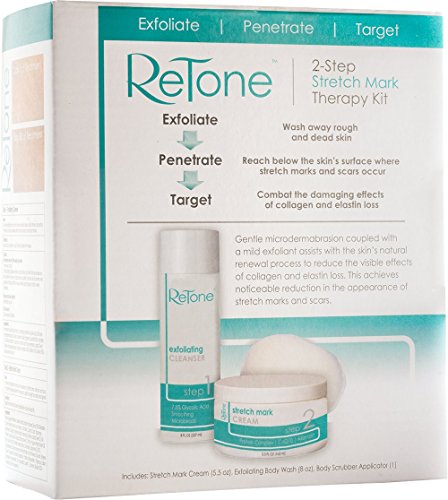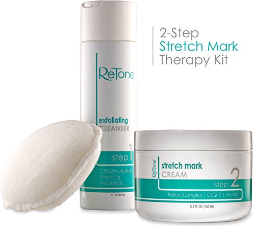 - SIMPLE (2) STEP APPLICATION: Step 1- Use the body scrubber to gently apply Retone Exfoliating Cleanser in the shower. Step 2- Apply Retone Stretch Mark Cream to dry skin twice a day in AM and PM.