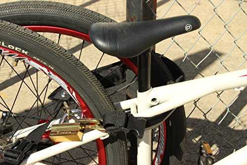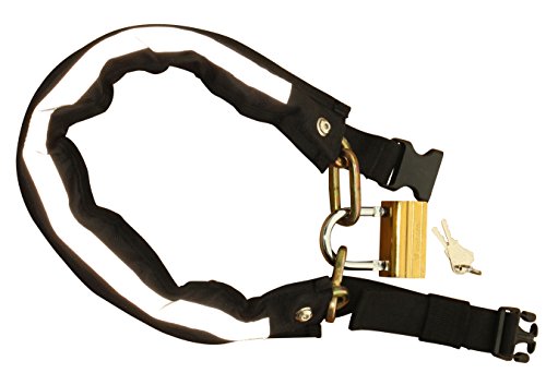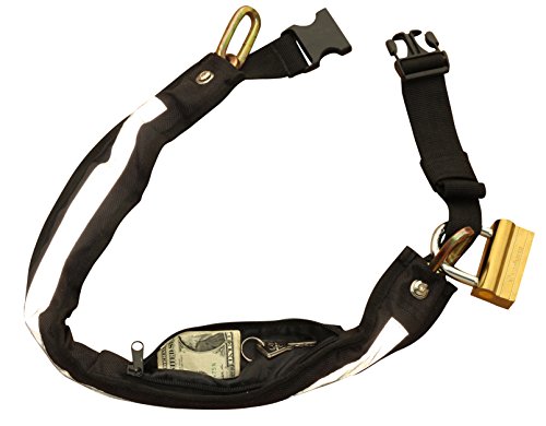 - Feature : First launched on Kickstarter! Weighs approximately 3 1/4 pounds with the padlock. Easy and comfortable to wear around your waist! Keeps a low center of gravity for safety. / Quickly adjusts to fit waist sizes from 26 inches to 40 inches. Easily clips and unclips around your waist with sturdy plastic clip. Keeps your hands free to ride with, not carry a lock. / 32 inches of 8mm secure steel chain, with a cover to protect bike from scratches. Long reflective strip on the back so cars can see you at night or dusk. Built in zippered pouch lets you carry your key and other items. / Padlock has a solid brass body and efficient-to-carry P lock design with 8.6mm thick, hardened shackle. / Buy yours today and keep your bicycle, scooter or motorcycle safe.