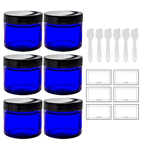 Cobalt Blue Glass Straight Sided Jar - 2 oz / 60 ml (6 pack) + Spatulas and Labels - Airtight, Smell Proof, BPA Free