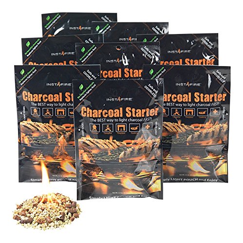 InstaFire charcoal briquette starter is optimal for lighting coals to grill on your home barbecue, at a camp site, while tailgating at a game, or anywhere you want to have a cookout. This set of eight individual packs of charcoal starter contains no harmful chemicals or vapors-just recycled apple and alder wood pellets, volcanic rock and a patented blend of food-grade paraffin wax. If you are sick and tired of the smell and taste of lighter fluid then InstaFire charcoal starter is for you. Put the packet under the charcoal briquettes in your grill or charcoal chimney, light the edges and your coals will be ready in minutes. The packet is made from corn sugar and is designed to inflame quickly. Each packet of charcoal briquette starter has a burn time of 10-15 minutes and will light up to 75 charcoal briquettes without flare-ups. InstaFire charcoal briquette starter is safe to store indoors or outdoors and won't cause any conflicts with local flammable storage ordinances. Keep some InstaFire charcoal briquette starter on hand for every day usage or as part of your emergency-preparedness plan. Whether you need to boil water, fry up fish, or grill steaks-at your home, a campsite, RV park, sports stadium, or any place you want to do some outdoor cooking-this eight-pack set of InstaFire charcoal briquette starter is a perfect solution for people cooking while protecting the environment. The product is made in the USA by Insta-Fire, Inc. It is safe, simple and versatile.Feature