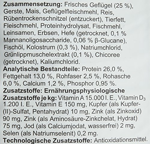 原材料:原材料:フレッシュチキン(25 %)・大麦・コーン・鶏肉粉・米・ビートパルプ(糖分除去)・動物性脂肪・肉粉・加水分解タンパク質・魚粉・亜麻仁・エンドウ豆・酵母(ドライ、マンナンオリゴ糖0.1 %、 ßグルカン0.06 %)・魚油・初乳(0.3 %)・岩塩・グリーンリップドマッセルエキス(0.1 %)・チコリ(ドライ)・塩化カリウム