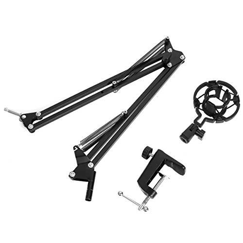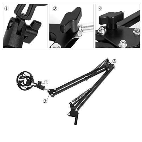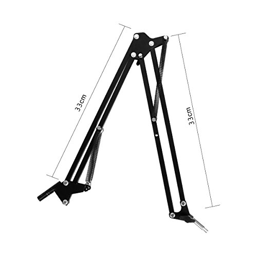 -. Feature : FOLDABLE ARM BAND - The adjustable scissor arm stand is made out of all Zinc alloy construction, sturdy and durable. Arms are lightweight and convenient, allow you to carry it with you easily, and adjust the suitable angle or height to show your perfect voice but doesn't dip or sink. / STABILITY - The base adopts a stable lock, which can support up to 6 cm of fixed objects. The bottom has a layer of sponges to maximize protect your desktop. Arm bends back and forth at the base, movement is solid and smooth. It doesn't dip or sink. When fixed, it will be more tighter with a fabric and also protect the top of the table. / SHOCKPROOF - The microphone clamps and sP.R.Ings can prevent vibration and reduce noise. The shock absorber microphones are made of plastic and rubber bands. Cooperate with the microphone spraying net, the effect will be better. / APPLICABLE DEGREE - The diameter of the microphone clip is 4.5 cm and fits most of the microphones on the market. It can be used in sound studio, recording studio, broadcast, stage and family performance. / 100% LIFETIME GUARANTEE - Replace defective products in a year, 30 days without hassle of refund and friendly customer support.
