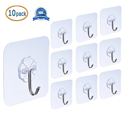 Ecjiuyi 10 Packs Reusable Adhesive Hooks,Transparent Heavy Duty Wall Hooks with No Scratch, Waterproof and Oilproof for Bathroom, Bedroom, Kitchen, Refrigerator Door, Wall and Ceiling