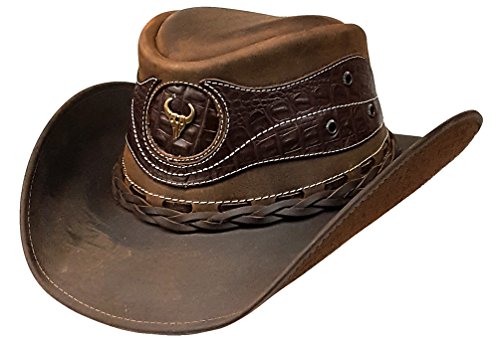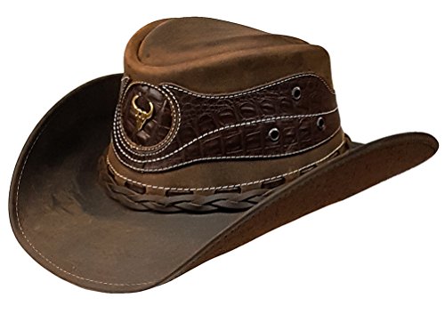 Binding : Apparel Product Description VA1489N top grain leather cowboy hat with leather embossed crocodile skin pattern appliques. Leather is hand antiqued weathered giving the color depth warmth. Wire around brim, for custom shaping. Satin-like Lined interior, sure-fit sizing padded sweatband for a comfortable snug fit everytime. Brim 3", Crown 4". Sizes: S,M,L,XL. For hat size Around head, just above eyebrows and ears. Hat Sizes: 54=21 1/4' | 55=21 5/8' | 56=22' | 57=22 3/8' | 58=22 3/4' | 59=23 1/4' | 60=23 5/8'. All natural leather has some small signature markings that make each hide unique such as scratches, wrinkles interesting color variations. Buy one of our quality Modestone Western Shirts, Belts Buckles in Kids Adult sizes to go with your fine Modestone Cowboy Hat. 0