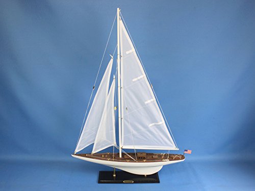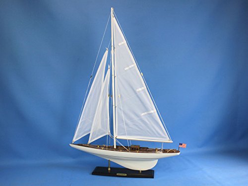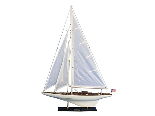 Studio : Handcrafted Model Ships Publisher : Handcrafted Model Ships Product Description With the winning spirit of her famous namesake the presence of this sailing ship model of Americas Cup winner Intrepid will brighten any room with the graceful speed of the waves and unbound freedom of the wind. The perfect highlight for a bedroom or beach house office or meeting room sailing from atop a table mantle or shelf Intrepid is a yacht model of true elegance.Features. Accurate model sailboat replica of the Intrepid. Handcrafted from scratch by our master artisans this is not a model ship kit. Researched from sources such as photos historical plans and original artwork. Wooden hull and deck parts built from rare high-quality woods. Wooden base with metal supports and a metal nameplate clearly showing the name Intrepid. High quality craftsmanship and details including. Accurate scale of all deck and hull components. Lifeboat tied-down on the deck. USA Flag. Three masterfully stitched sails with extensive rigging. Pre-assembled simply attach the masts and display. Ready to display in less than five minutes. Insert mast in designated hole and clip brass rigging hooks as shown in illustrations. Sails and rigging already complete. Size - 35 in.. Dimension - 24 L x 4 W x 35 H in. 0