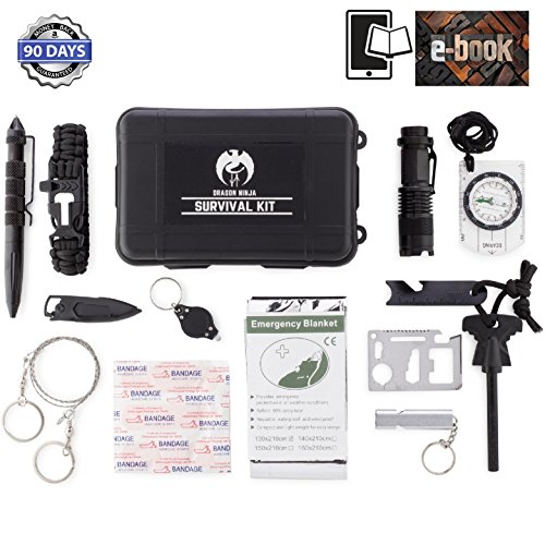 - TOOLS INCLUDED: Looking for a survival kit that has it all? This unique 14 in 1 Kit features : a Tactical Flashlight, Tactical Pen, Wire saw, Large Ferrocerium Rod Flint, a Compass with ruler, 1 Compact Stainless Steel Folding Knife, Tactical Aluminum Emergency Whistle, an 11-in-1 Multi Function Pocket Card, a Finger Flashlight, Emergency thermal Blanket, and Bandages all encased in a Shock Absorbent and Water Resistant Case. For a limited time Includes FREE Paracord Bracelet and EBOOK!