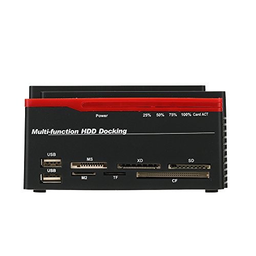 Studio : KKmoon Publisher : KKmoon Binding : Electronics Product Description Specification: Material: ABS Metal Color: Red Black Interface: 1 * USB 3.0, 2 * USB 2.0, 1 * TF, 1 * M2, 1 * MS, 1 * XD, 1 * CF, 1 * SD Fits HDD size: 2.5inch/ 3.5inch SATA IDE HDD capacity: Up to 6TB Hot plug: Support Input voltage: 100V-240V 50/60Hz 1.5A Output voltage: DC 12V 3000mA Output interface: 480Mbps(USB2.0); 5Gbps(USB3.0) Integrated card reader: for SD/Mini SD/Micro SD card, TF card, CF card, M2 card and MMC/MS cards. Operating system: for Win98/7/Me/2000/XP/Vista, for Mac OS9.X and higher Operating environment: 0℃-50℃ for use, -20℃-70℃ for storage Item weight: Approx. 590g/ 1.3lb Plug: EU,US,AU,UK(optional)