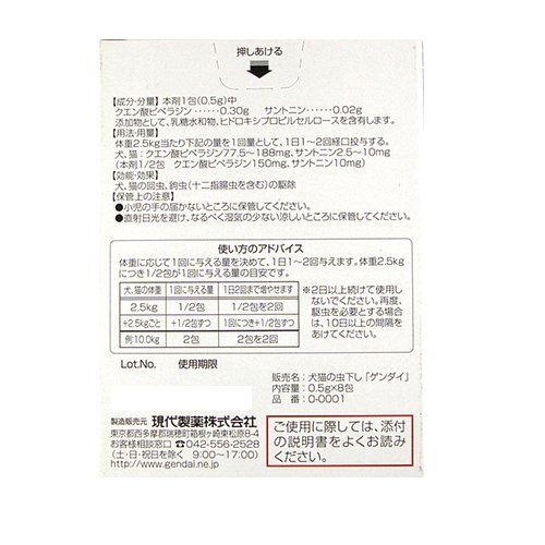 犬、猫:クエン酸ピペラジン77.5~188mg、サントニン2.5~10mg