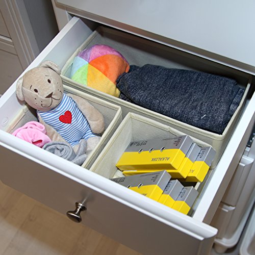 EZOWare Storage Organizers are a convenient way to keep your drawers tidy and organized. This set of boxes comes with 2 square organizer bins (each 5.5 x 5.5 x 4 inch), and 1 rectangular organizer bin (11.4 x 5.5 x 4 inch) you can arrange any way you want in the drawer. It comes in a bundle of 3 to offer plenty of storage for accessories, socks, undergarments, & clothes. Plenty of way to organize your drawers and closets using storage bins!