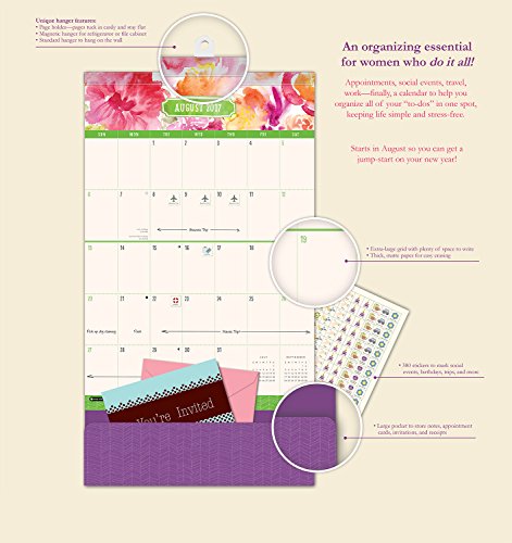 - 17-Month calendar keeps the whole family organized and informed in one place; plenty of room to write; over 300 stickers for marking events; thick paper to allow Easy erasures