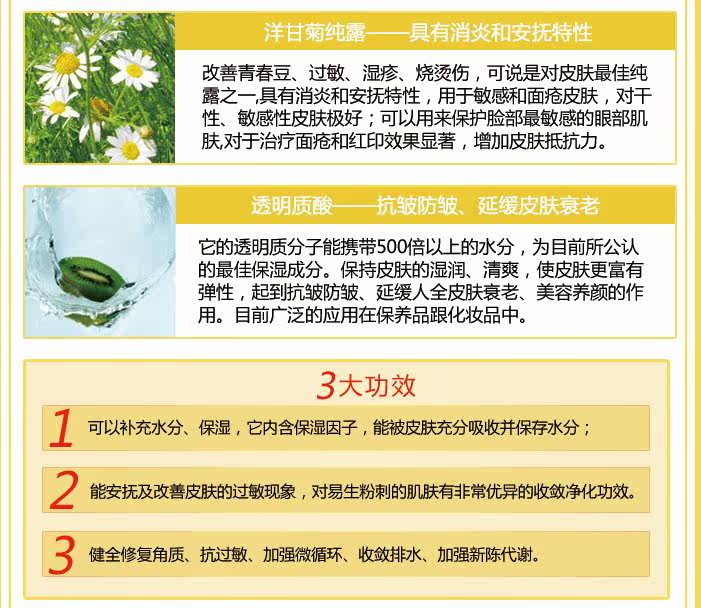 1,洋甘菊纯露性质及其温和,任何皮肤都可安心使用,尤其适合于敏感皮肤,婴儿娇嫩的皮肤护理。