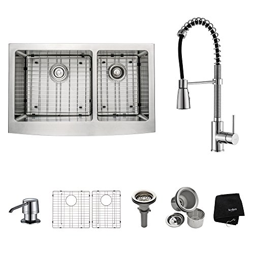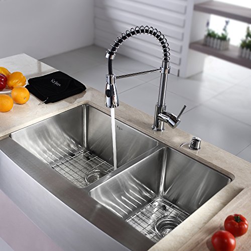 Kraus KHF203-33-KPF1612-KSD30CH 33 inch Farmhouse Double Bowl Stainless Steel Kitchen Sink with Chrome Kitchen Faucet and Soap Dispenser