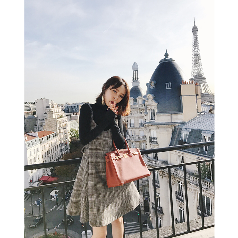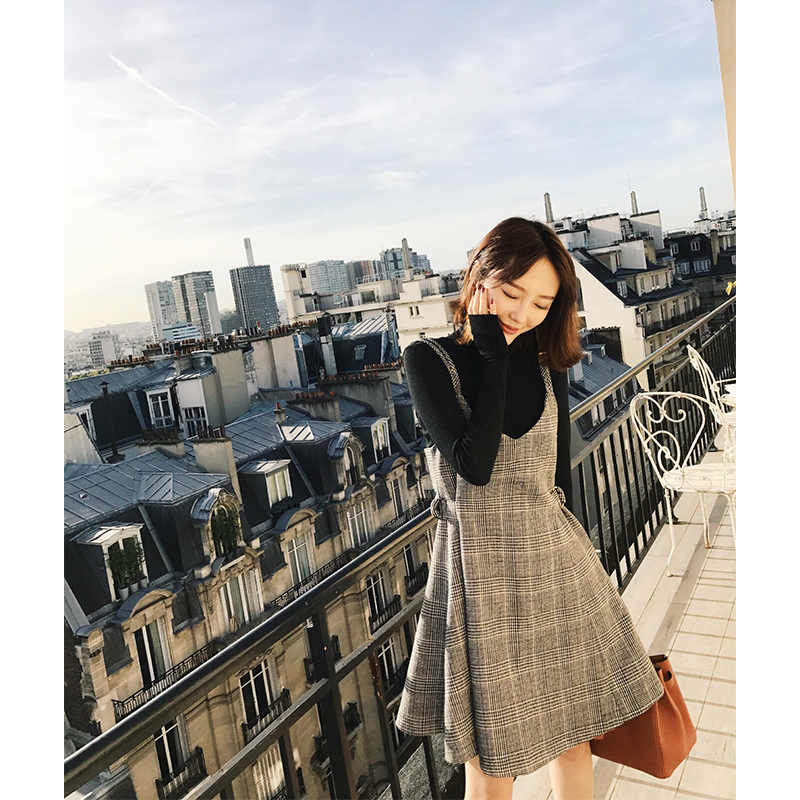 这款花纱格纹吊带连身裙,面料选用薄呢纱线织造的经典格纹面料,