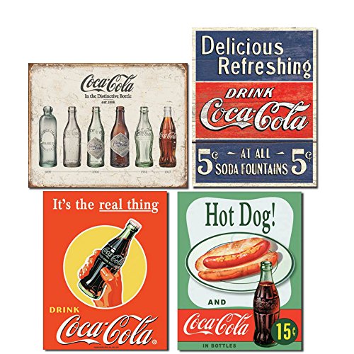 Vintage Coca Cola Tin Signs Retro Bundle - Coca Cola Bottle Evolution, Coke Delicious 5 Cents, Coke Real Thing Bottle and Hot Dog & Coca Cola