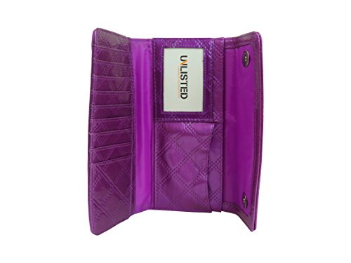 -. Feature : Dimensions: 8.5" x 4" x 1" ~ Material: Man made PVC / Magnetic snap flap ~ 6 Credit Card Slot ~ Pix ID window ~ MSRP $ 60.00 / Outer zipper pocket ~ 2 Billfold Slip Pockets ~ Small zipper pocket