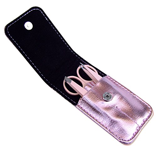 - Feature : Hair removal is a constant, on going personal grooming regiment. Isn't time you invest in a set of quality tools to get the job done right? / Even if you use bleaching cream, depilatories or waxes on a regular bases, stray hair could pops up unexpectedly. Arm yourself with this travel friendly tweezers kit and quickly get rid of embarrassing upper lip hair, chin hair or unibrows. / The key to a pair of perfectly shaped brows isn't just tweezing. Trimming long brow hair is equally important. This kit includes a matching brow scissors for at home eyebrow grooming session. / Grooming set includes one slant tip tweezers, one pointed tip tweezers and one curved eyebrow scissors. All three tools fits into a neat pink color carrying case which protects the sharp tips. Its small size is convenient for traveling or on the go. / This high quality eyebrow tweezers set is backed by a 100% guarantee. This introductory price is only available for a limited time, grab your set while you can!