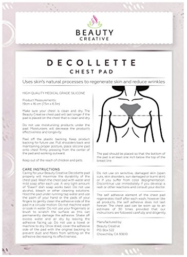 -. Feature : ❤FEEL YOUTHFUL - Anti Wrinkle Chest Pads, TOP QUALITY Medical Grade Used for Decollette Cleavage Breast Area / ❤YOUR SKIN DOES THE WORK - Use Your Skins Natural Abilities to Correct Prevent Smooth and Treat Sun Damage Creases While Sleeping / ❤INCREDIBLY GENTLE - Fully Hypoallergenic Therapy - Made of Ultra Smooth Silicone / ❤LOOK, WE ARE HONEST - These Chest Pads will last UP TO 60 Days - No Chest Pad Lasts Forever - EASY TO FOLLOW INSTRUCTIONS MAKES THEM LAST!! / ❤WE CARE ABOUT YOU BEING BEAUTIFUL - No dangerous chemicals or liquids The Beauty Creative Anti Wrinkle Chest Pad uses no chemicals or moistening agents.