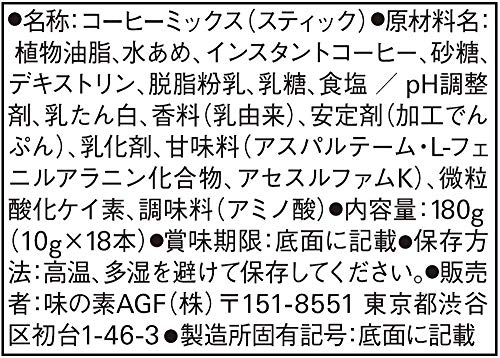 原材料:植物油脂、水あめ、インスタントコーヒー、砂糖、デキストリン、脱脂粉乳、乳糖、食塩、pH調整剤、乳たん白、香料(乳由来)、安定剤(加工でんぷん)、乳化剤、甘味料(アスパルテーム・L-フェニルアラニン化合物、アセスルファムK)、微粒酸化ケイ素