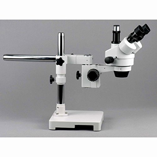 Professional stereo microscope with boom stand has long working distance to enable users to perform work or manipulate large items, including circuit boards and dental appliances