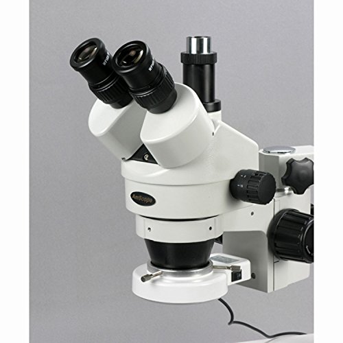Trinocular viewing head with pairs of 10x and 20x super-widefield eyepieces, adjustable interpupillary distance, fixed 45-degree vertical inclination to reduce eye and neck strain, and 360-degree rotation capability to enable sharing