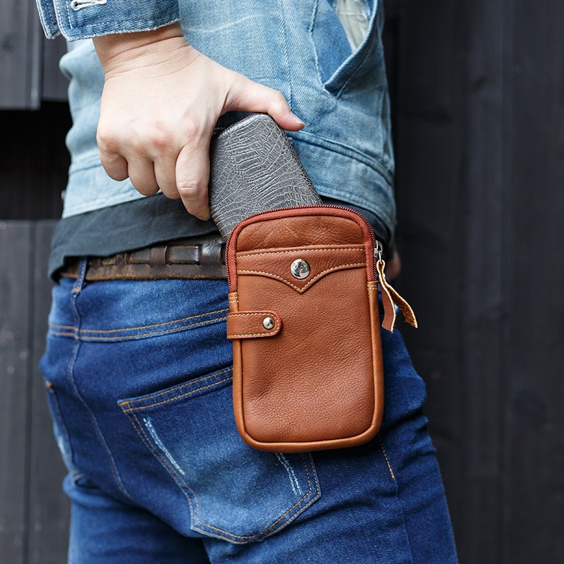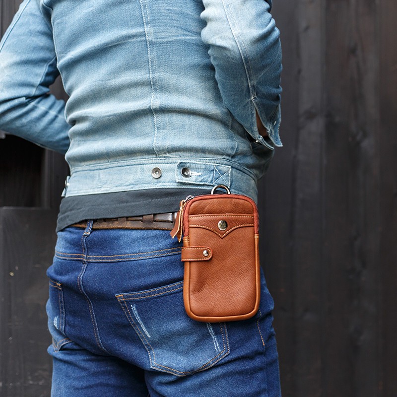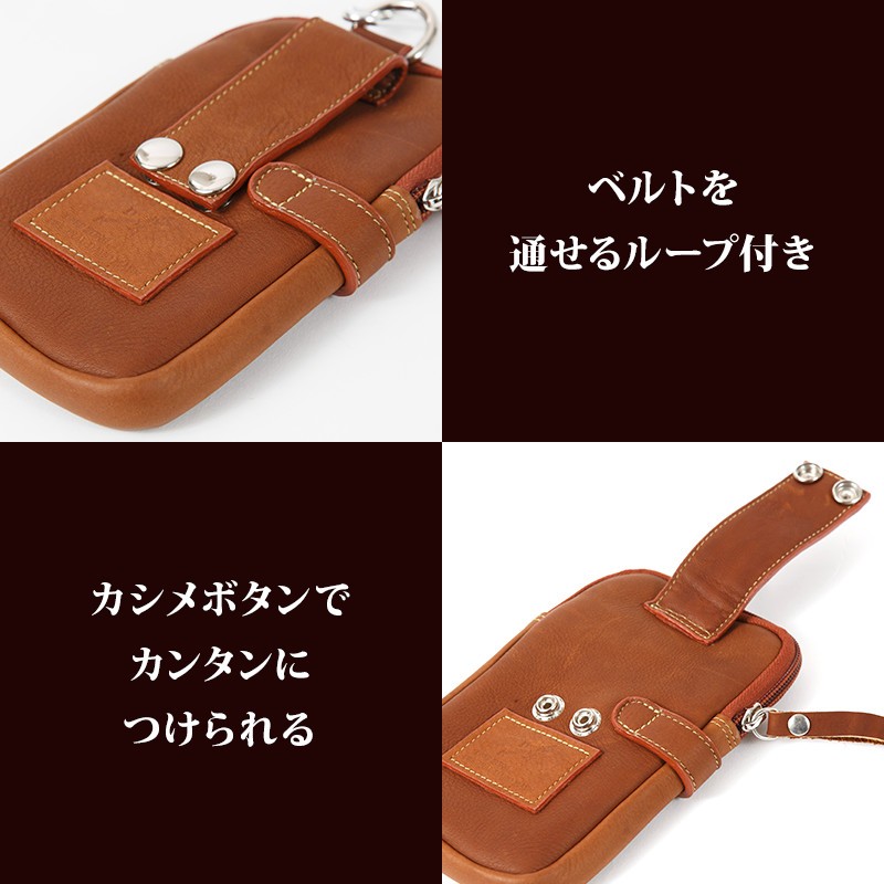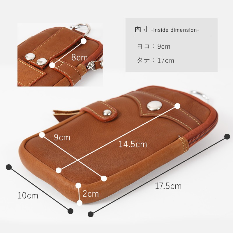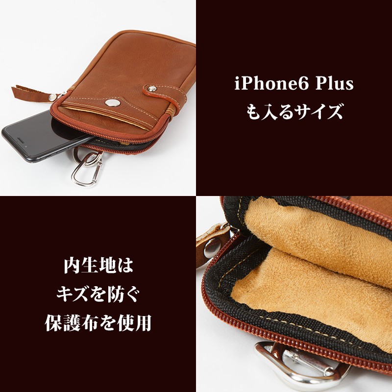 高さがしっかりあり、iphone6も入る大きさです。柔らかいシュリンクレザーを使用しているので、腰に付けても邪魔になりません。高さがありますが、薄マチ設計ですので違和感なく着用できます。