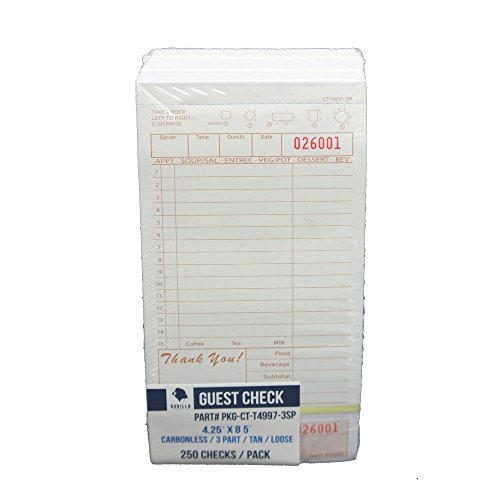- Guest Check PKG-CT-T4997-3SP 3 Part Carbonless, Perforated, Tan, 4.25" x 8.45" Qty: 250 (loose)