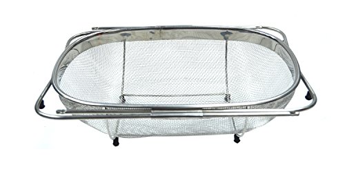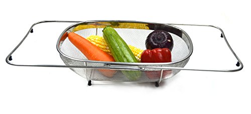 SAMMART Over The Sink Stainless Steel Oval Colander / Mesh Strainer Basket with Extendable Handles & 4 Rubber Tabs