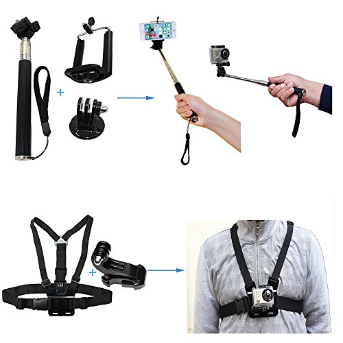 Gopro accessories kit includes accessories hard case, selfie stick monopod, chest mount harness, head strap, car mount, floating hand grip, 3-way pivot arm, tripod mount adapter, quick release buckle, headlebar seatpost and pivot arm, wrist strap, phone bracket clamp, flat adhesive mounts and pads, curved adhesive mounts and pads, octopus tripod holder, J-hook buckle mounts, anti-fog inserts and small nylon bag