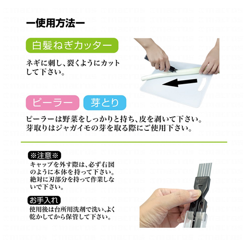 ●スッと引くだけ簡単、あっという間に白髪ねぎ!キャップを付け替えるだけで、ピーラー/芽とりにも使える!