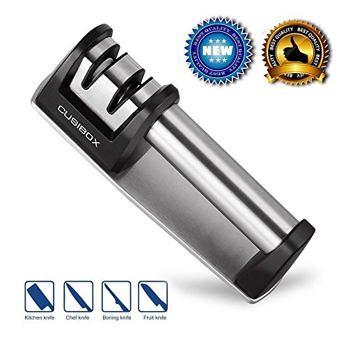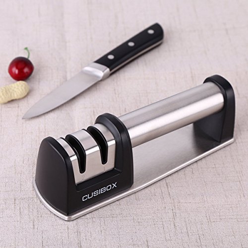 Your new CUSIBOX Knife Sharpener is the perfect tool for keeping all of those kitchen, utility, pocket and hunting knives in top shape.Two-Stage Sharpening Design: Coarse sharpening & Fine honing.STAGE 1 (Coarse) uses the diamond grinder blades to re-shape your knife, restoring the dullest, damaged knives back into shape.