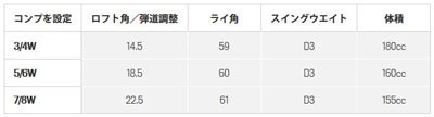 라이각(도):3-4 F 59 /5-6 F 60/7-8 F 61/헤드 체적(cm3):3-4 F 180 /5-6 F 160 /7-8 F 155/클럽 길이(인치): 3-4 F 43.25 /5-6 F 42.75 /7-8 F 42.25