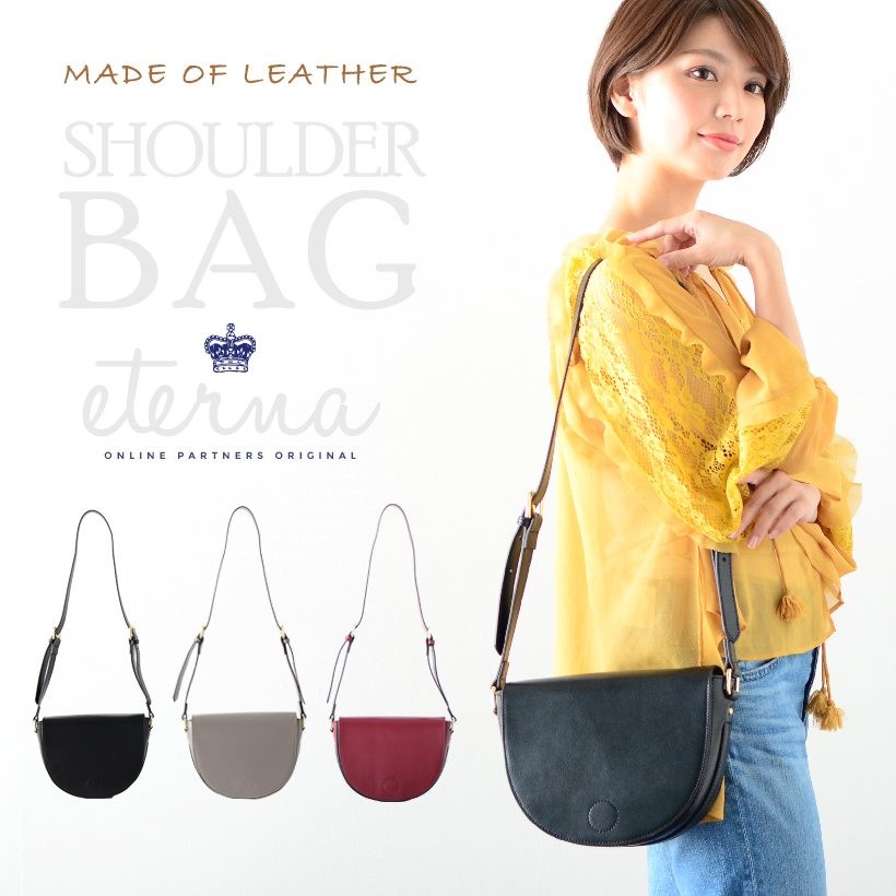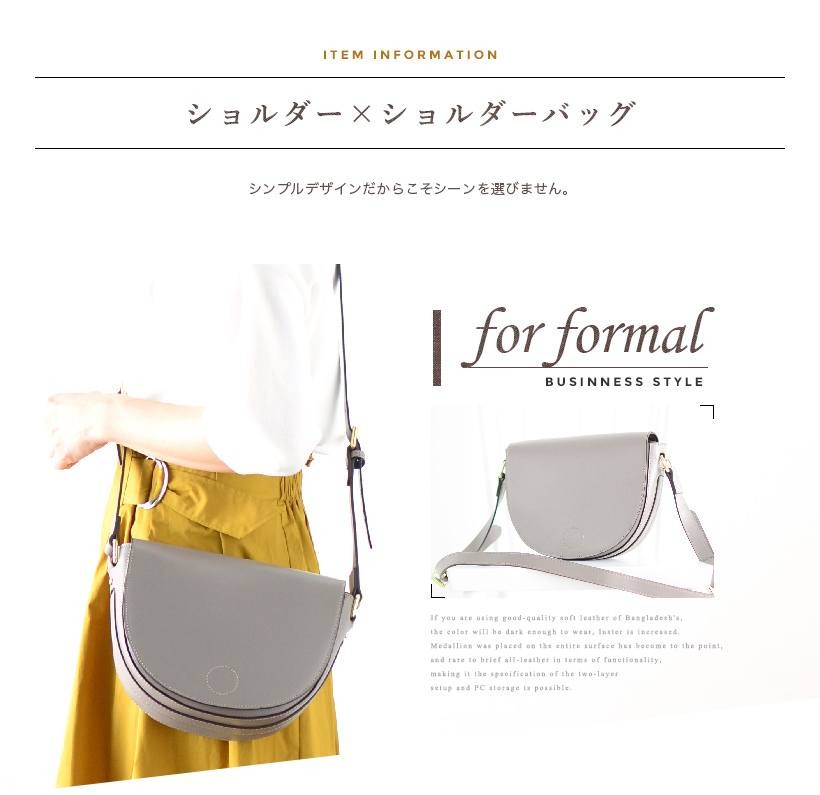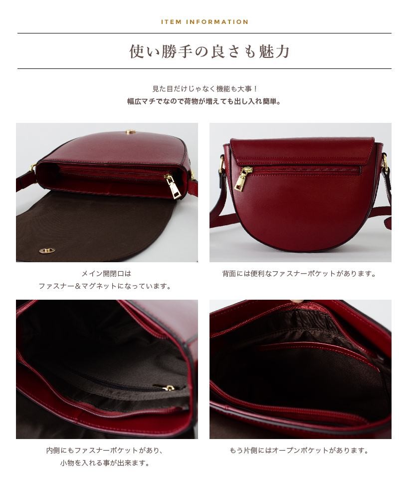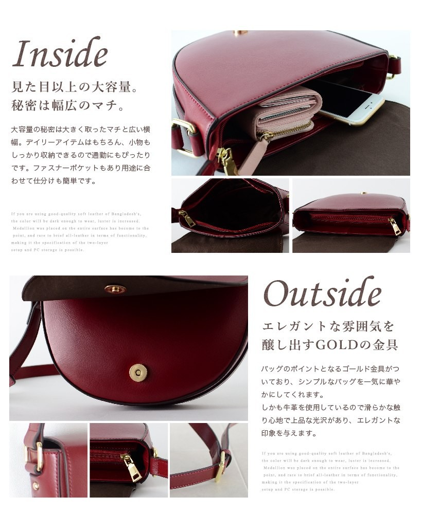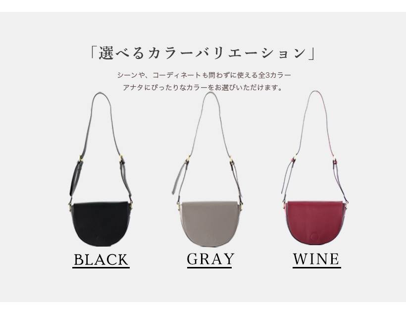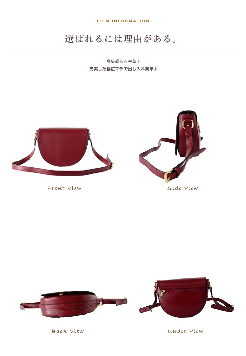 スタイリッシュでシンプルな牛革ショルダーバッグ。コロンと丸いシルエットがオトナ女子のコーディネートに茶目っ気を与えてくれます。スリムなデザインながらしっかりとマチがあり、必需品の収納は可能。ショルダーベルトは持ち方によってサイズ調節が可能なベルト仕様。高級感のあるフォルムできれいめスタイルはもちろんカジュアルにも合います。●SIZE:高さ:約17.5cm / 幅:約25cm / マチ:約7cm●ショルダーベルト長さ:約100~116cm×幅:約2.1cm(取り外し不可能/調節可) 持ち手高さ:約45~53cm●外ポケット:背面ファスナー付きポケット1●内ポケット:オープンポケット1、ファスナー付きポケット1●重さ:約560g●素材:牛革●バッグのメイン開閉口はマグネットになっております。[カラー]ブラック・グレー・ワインメーカーより取り寄せ商品のため、在庫状況によっては欠品・廃盤の可能性があります。あらかじめご了承ください。