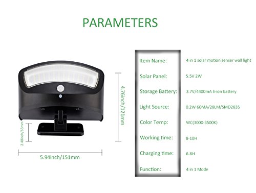 - 5 Modes to Choose: Solar Porch Light have 5 modes to choose what you wanted. (Motion Sensor & Dim Light Mode, Motion Sensor Mode, Full Bright Mode, SOS Mode, Off)
