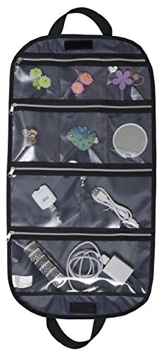 Design: Total 9 Separate Clear Zipper Compartments. -Include 3 Small pockets(3 1/2"(W) * 3 3/10"(H)) for easily fit 2 pairs of earrings/4 or 5 rings in each pocket. -3 medium pockets(3 1/2"(W) * 4 1/2"(H)) to hold your big loop earrings, watches. -2 large pockets (5 3/10"(W) * 4 1/2"(H)) for organize your necklace, nail polish etc. -One extra large pocket (10 2/5"(W) * 4 1/2"(H))big enough for a chunky "statement" necklace and bracelets