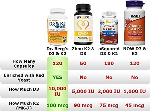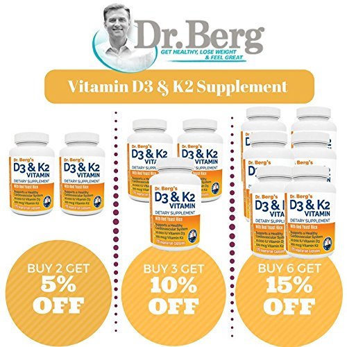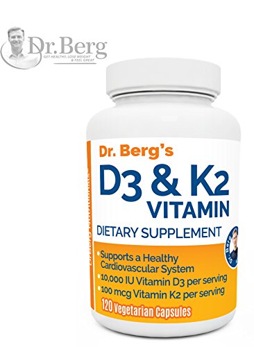 -. Feature : THE AMAZING COMBINATION | Vitamins K2 & D3 work together to help absorb and transport calcium to the correct places on the body. Most people know the benefits of Vitamin D (maintaining strong bones, immune system support, healthy muscle function, etc.), but many don't know that Vitamin D assists Vitamin K2 to work at it's capacity. Our Vitamin K2 (MK-7) is a natural source and helps support healthy bones. Dr. Berg recommends using the combination of 10,000 IUs of D2 and 100 mcg of K2. / 100% SATISFACTION GUARANTEED | With over 25 years of experiencing assisting over 45,000 patients in achieving healthy weight loss, Dr. Berg has created a line of products that support his message of 'getting healthy to lose weight, not losing weight to get healthy.' If for any reason you are not happy with the results you experience within the first 30 days of taking the Vitamin D3 & K2 Supplement, we're happy to give you a full refund! Just send us a message on Amazon. / STRONG BONES | Vitamin D3 normally helps absorb calcium from the intestines by a factor of 20X. With this complex, you'll get the benefits absorption as well as transporting calcium into bones through the help of K2. Vitamin K2 (as MK-7) directs the calcium to your bones instead of soft tissues, where too much calcium could be problematic. / HEALTHY CARDIOVASCULAR SYSTEM | This formula not only promotes the proper absorption of calcium with D3, but the correct distribution to your bones where it should be normally. / VEGETABLE CAPSULES | Now in a vegetable capsule, this 100% vegan product can be taken without concern of animal products.