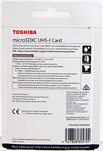 Package Dimensions:5.9 x 4 x 0.2 inches Item Weight:0.32 ounces Shipping Weight:0.32 ounces (View shipping rates and policies) Manufacturer:TOSHIBA MEMORY CORPORATION ASIN:B01MRR9440 Item model number:THN-M401S0640A2 Customer Reviews:5.0 out of 5 stars 2 customer reviews 5.0 out of 5 stars Best Sellers Rank:#168,663 in Cell Phones & Accessories (See Top 100 in Cell Phones & Accessories) #970 in Cell Phones & Accessories > Cell Phone Accessories > Micro SD Cards #168,261 in Electronics > Cell Phones & Accessories Date first listed on Amazon:January 8, 2018