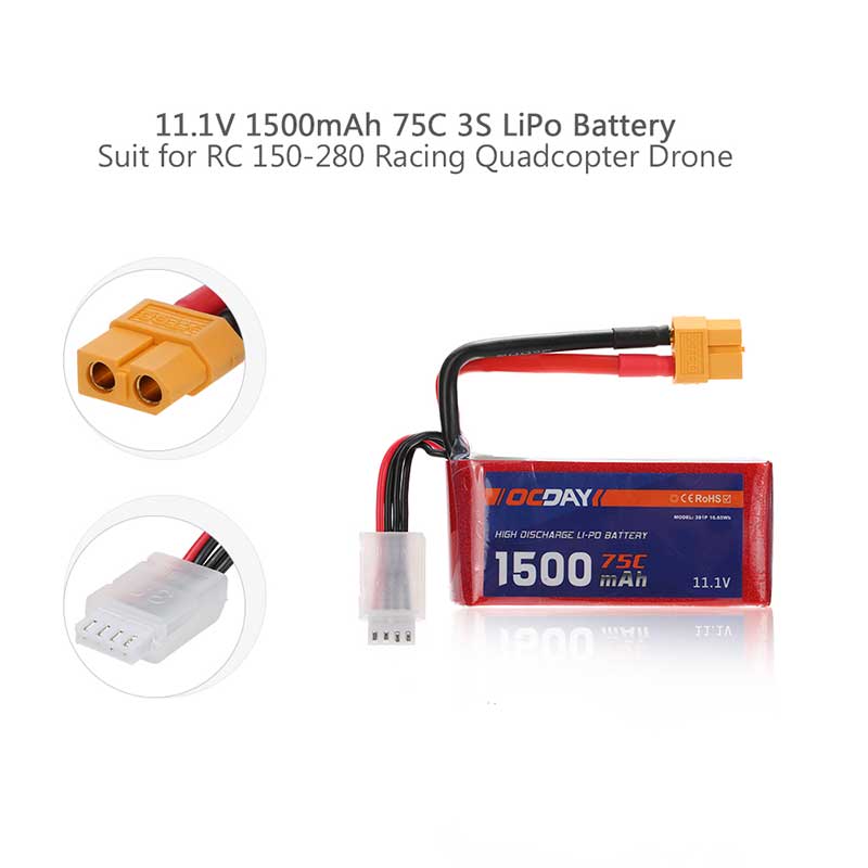 This 11.1V 1500mAh 75C 3S lipo battery is designed for 150-280 racing quadcopter RC super fans. With high discharge rate ability, it can let the drone get more strong power to take off and speed up. If you love your RC drone, it will be a good and economical choice.