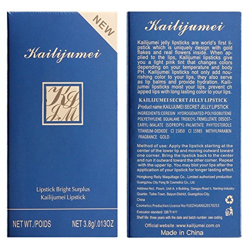 Effect: Color-changing by temperature. Type: Lipstick Texture: paste Shelf life:3 years Want to be a make up talent? If you have it, it will come true. It is absolutely safe for you to use them. Please Note: that due to lighting effect and computer color, the actual colors may be slightly different from the picture Ingredients:candelilla resin,cocoa butter,beeswax,olive oil,citric acid,plant extracts,stearyl alcohol,grape seed oil,lavender oil,etc.(4 kinds of Dried flowers in paste) Benefits:moist lips,prevent chapped lips,Lips Care,healthy and safe,color is not easy to fade Notice: that Four out of the color change color are similar very close color , but different flowers inside .The color will different in different temperature . so everyone has own exclusive lip color.Feature