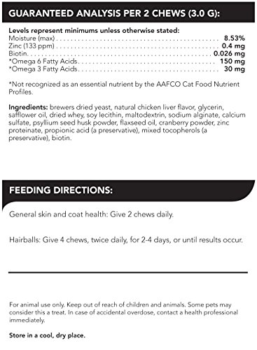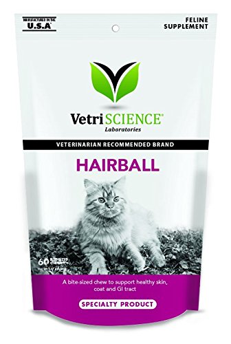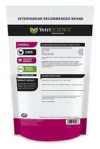 -. Binding : Misc. -. Brand : VetriScience Laboratories -. EAN : 0026664005083 -. Feature : Vetri Hairball contains omega fatty acids which provide essential fats for skin and coat health while also supporting the lining of the GI tract / Hairball works by promoting a healthy GI tract on the inside and healthy skin on the outside without the use of diuretic herbals or mineral oil / Vetri Hairball is a delicious chicken liver flavored soft chew that cats love / Vetri Hairball supports the skin and coat, helping to keep your pets coat healthy, shiny and soft / VetriScience products are manufactured in the U.S.A. and are backed by a 100% Satisfaction Guarantee -. Label : Vetri-Science Laboratories -. Manufacturer : Vetri-Science Laboratories -. Model : 0900866.060 -. MPN : 0900866.060 -. PackageQuantity : 1 -. PartNumber : 0900866.060 -. ProductGroup : Pet Products -. ProductTypeName : PET_SUPPLIES -. Publisher : Vetri-Science Laboratories -. Studio : Vetri-Science Laboratories -. Title : VetriScience Laboratories Hairball Digestive Support Chicken Liver Flavored 60 Soft Chews for Cats -. UPC : 026664005083