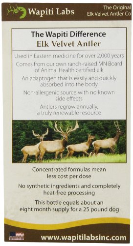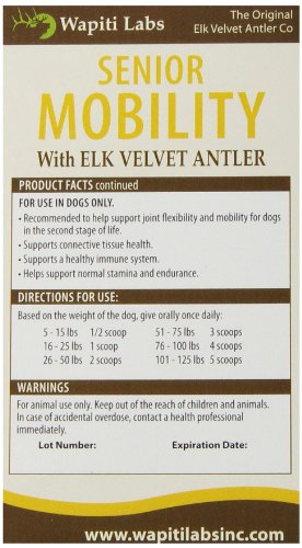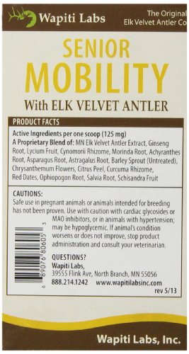 Senior mobility pet supplement for dogs with Elk velvet Antler and additional ginseng helps support joint flexibility and mobility for dogs in the second stage of life. As pets age, they need additional support for their joint, kidneys and immune system. Using the same natural blend of Elk velvet Antler and traditional hebs found in Wapiti Labs mobility formula, senior mobility has been reformulated specially for the senior dog. It also contains a higher level of ginseng for additional support. Supports and maintains long term health supports and maintains proper body functions and overall good quality of life helps maintain joint mobility helps support normal stamina and endurance supports a healthy immune system and normal blood cell health supports normal function and health of the kidneys supports eye function contains additional ginseng, an adaptogen, which is a complex natural substance that adapts to a body's needs. formulated for: dogs in the second stage of life dogs that have slowed down in their golden years dogs that are affected by cold, damp weather dogs that cry and refuse to climb stairs keeps your dog active for additional years - perfect for hunting, agility, etc.Feature