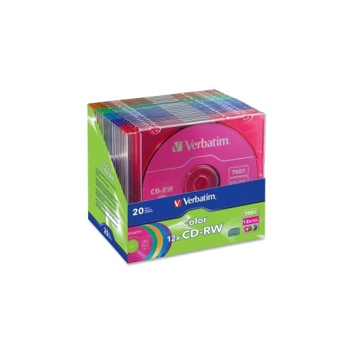 Studio : VERBATIM CORPORATION Publisher : VERBATIM CORPORATION Binding : Electronics Product Description Brand Name: Verbatim Product Model: 96685 Product Name: CD-RW 80MIN 700MB 12x Color 20pk Matching Color Slim Cases Marketing Information: Colorful CD-RWs can be erased and rewritten multiple times with a certified 4X to 12X ultra-speed rewrite compatibility. Each disc features a 700MB/80 minute capacity and branded surface and includes a slim jewel case with matching color. Advanced super-eutectic phase change recording layer ensures durability and reliability while archiving data at higher rewrite speeds. CD-RW allows you to rewrite data without errors up to 1,000 times. Discs are read compatible with multi-read CD and DVD drives. Packaged Quantity: 20 Packing: Slim Case Product Type: CD Rewritable Media Storage Capacity: 700 MB Maximum Write Speed: 12x Media Formats: CD-RW Recycled: No Recycled Content: 0% Post-consumer-waste%: 0% Assembly Required: No 0